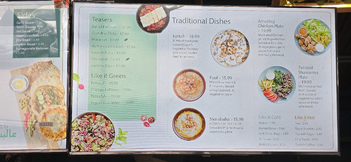 The traditional dishes like the Twisted Shawarma plate, featuring marinated grilled beef, and Musabaha, a hummus variation served with fresh vegetables, showcase a balance of textures and bold spices. For those seeking hearty comfort, the Foul and Fatteh plates offer rich, slow-cooked legumes enhanced by garlic and yogurt, creating warmth in every bite.